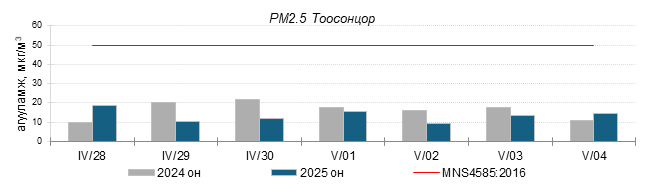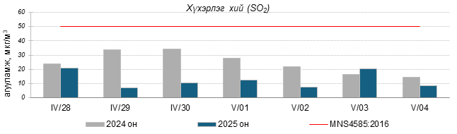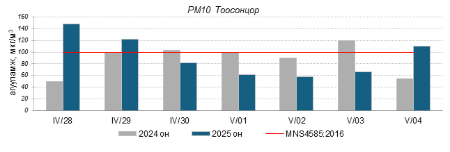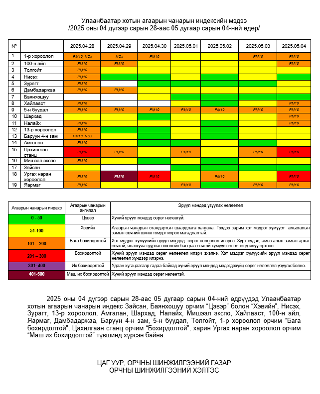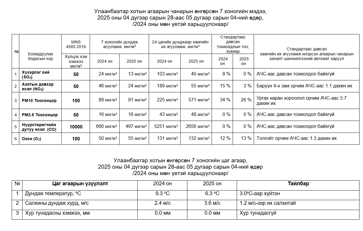 Улаанбаатар хотын агаарт түгээмэл бохирдуулах бодис хүхэрлэг хий /SO2/, азотын давхар исэл /NO2/, тоосонцор /PM10, PM2.5/, нүүрстөрөгчийн дутуу исэл /CO/, озон /O3/-ны агууламжийг тодорхойллоо.