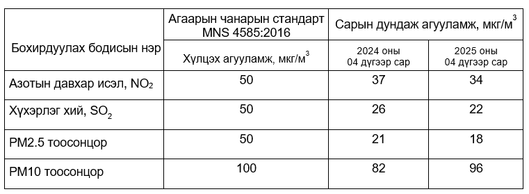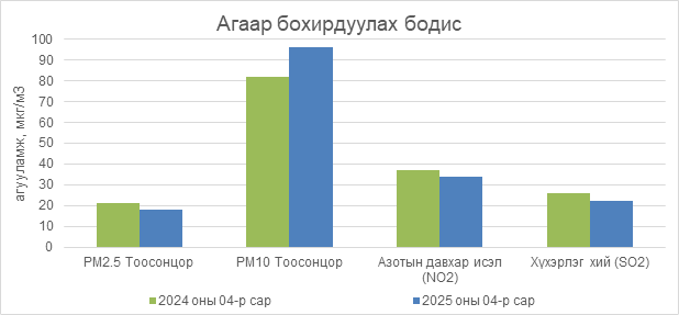 Улаанбаатар хотын агаар бохирдуулах бодисын 2025 оны 04 дүгээр сарын дундаж агууламжийг өмнөх оны мөн үе 2024 оны 04 дүгээр сарын дундаж агууламжтай харьцуулахад азотын давхар исэл (NO2) нь 3 мкг/м3-ээр буюу 8 %-иар, хүхэрлэг хий (SO2) нь 4 мкг/м3-ээр буюу 15 %-иар, PM2.5 тоосонцор 3 мкг/м3-ээр буюу 14%-иар тус тус бага, харин PM10 тоосонцор 14 мкг/м3-ээр буюу 17%-иар их байна.