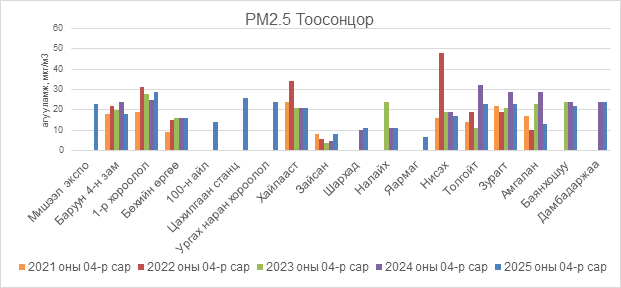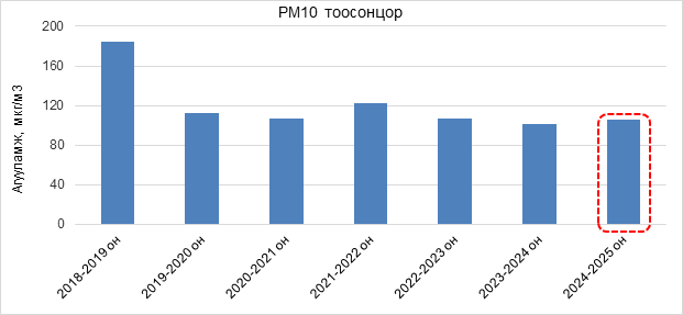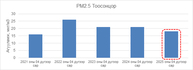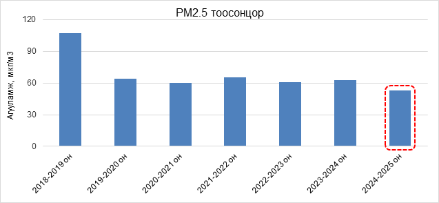 2024 оны 10-12, 2025 оны 1-4 дүгээр сарын PM2.5 тоосонцрын дундаж агууламжийг өмнөх онуудтай харьцуулахад 2018-2019 оноос 54 мкг/м3-ээр буюу 50%-иар бага, 2019-2020 оноос 11 мкг/м3-ээр буюу 17%-иар бага, 2020-2021 оноос 7 мкг/м3-ээр буюу 12%-иар бага, 2021-2022 оноос 12 мкг/м3-ээр буюу 18%-иар бага, 2022-2023 оноос 8 мкг/м3-ээр 13 %-иар бага, 2023-2024 оноос 10 мкг/м3-ээр 16%-иар бага байна.