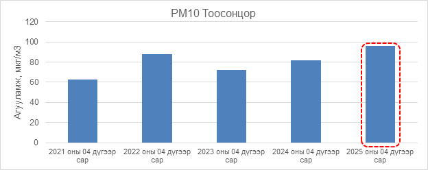 Улаанбаатар хотын агаар дахь PM10 тоосонцрын 2025 оны 04 дүгээр сарын дундаж агууламжийг 2021-2023 оны 04 дүгээр сарын дундаж агууламжаас 8-33 мкг/м3-ээр буюу       9-52 %-иар их, 2024 оны 04 дүгээр сарын дундаж агууламжаас 14 мкг/м3-ээр буюу 17 %-иар их байна (Зураг 4).