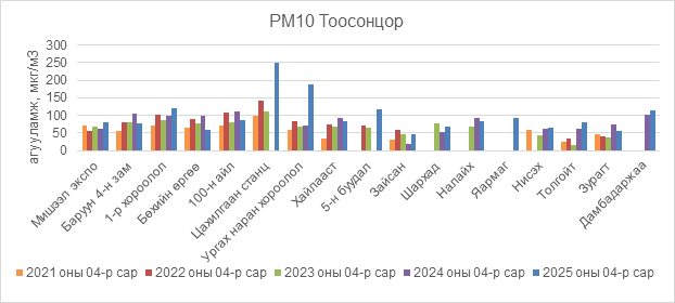 2025 оны 04 дүгээр сарын РМ10 тоосонцрын дундаж агууламж Цахилгаан станц 250 мкг/м3, 5-н буудал 116 мкг/м3-ээр, Яармаг 94 мкг/м3 байна. 2024 оны 04 дүгээр сарын дундаж агууламжтай харьцуулахад Баруун 4-н зам 30 мкг/м3-ээр, Бөхийн өргөө 40 мкг/м3-ээр, 100-н айл 25 мкг/м3-ээр, Хайлааст 8 мкг/м3-ээр, Налайх 10 мкг/м3-ээр, Зурагт 17 мкг/м3-ээр тус тус бага, харин Мишээл экспо 17 мкг/м3 -ээр, 1-р хороолол 21 мкг/м3-ээр, Ургах наран хороолол 118 мкг/м3-ээр, Зайсан 30 мкг/м3-ээр, Шархад 16 мкг/м3-ээр, Нисэх 5 мкг/м3-ээр, Толгойт 18 мкг/м3-ээр, Дамбадаржаа 14 мкг/м3-ээр тус тус их байна (Зураг 5).