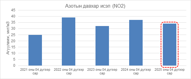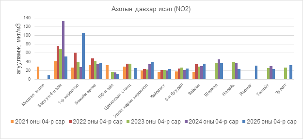Азотын давхар ислийн (NO2) 2025 оны 04 дүгээр сарын дундаж агууламж 2021, 2023 оны 04 дүгээр сараас 2-9 мкг/м3-ээр буюу 6-36 %-иар их, 2022 оны 04 дүгээр сарын дундаж агууламжтай харьцуулахад 5 мкг/м3-ээр буюу 13 %-иар бага, 2024  оны 04 дүгээр сарын дундаж агууламжтай харьцуулахад 3 мкг/м3-ээр буюу 8%-иар бага байна (Зураг 6).