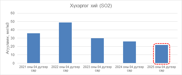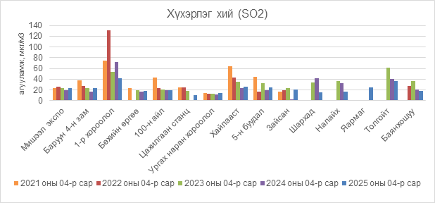 Агаар дахь хүхэрлэг хийн (SO2) 2025 оны 04 дүгээр сарын дундаж агууламжийг 2021-2023 оны 04 дүгээр сарын дундаж агууламжтай харьцуулахад 8-27 мкг/м3-ээр буюу 27-55 %-иар бага, өмнөх оны мөн үе буюу 2024 оны 04 дүгээр сарын дундаж агууламжтай харьцуулахад 4 мкг/м3-ээр буюу 15%-иар бага байна (Зураг 8).