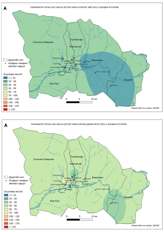 2025 оны 04 дүгээр сард хүхэрлэг хий (SO2)-н дундаж агууламж  Цахилгаан станц 11 мкг/м3, Яармаг 25 мкг/м3 байна. 2024 оны 04 дүгээр сартай харьцуулахад 1-р хороолол 30 мкг/м3-ээр, 100-н айл 1 мкг/м3-ээр, Шархад 27 мкг/м3-ээр, Налайх 15 мкг/м3-ээр, Толгойт 5 мкг/м3-ээр, Баянхошуу 3 мкг/м3-ээр тус тус бага, харин Мишээл экспо 3 мкг/м3-ээр, Баруун 4-н зам 7 мкг/м3-ээр, Бөхийн өргөө 1 мкг/м3-ээр, Ургах наран хороолол 2 мкг/м3-ээр, Хайлааст 2 мкг/м3-ээр, 5-н буудал 5 мкг/м3-ээр, Зайсан 18 мкг/м3-ээр тус тус их байна (Зураг 9).
