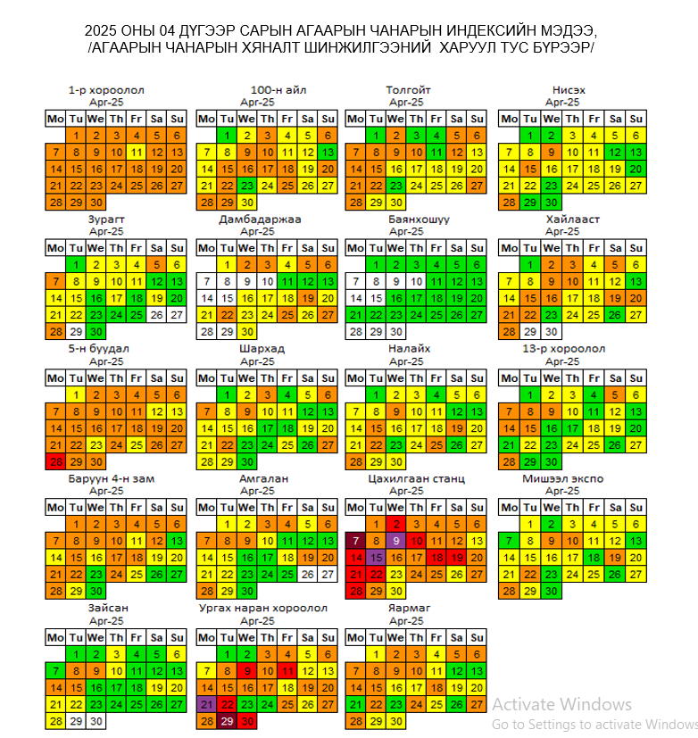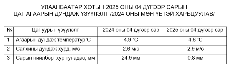 УЛААНБААТАР ХОТЫН ХҮЙТНИЙ УЛИРЛЫН АГААРЫН ЧАНАРЫН ТӨЛӨВ БАЙДЛЫН ТОЙМ /2025 ОНЫ 04 ДҮГЭЭР САР/