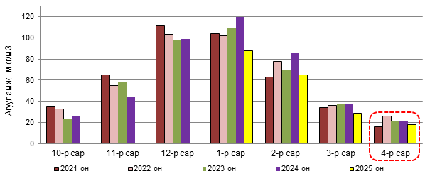 Улаанбаатар хотын агаар дахь PM2.5 тоосонцрын 2025 оны 04 дүгээр сарын дундаж агууламжийг 2021 оны 04 дүгээр сарын дундаж агууламжтай харьцуулахад 2 мкг/м3-ээр буюу 12 %-иар их, 2022, 2023 оны 04 дүгээр сарын дундаж агууламжтай харьцуулахад 3-8 мкг/м3-ээр буюу 14-31 %-иар бага, 2024 оны 04 дүгээр сарын дундаж агууламжтай харьцуулахад  3 мкг/м3-ээр буюу 14%-иар бага байна. (Зураг 2).