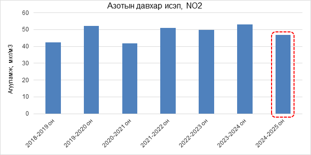 2024-2025 оны хүйтний улиралд агаар дахь азотын давхар ислийн (NO2) хамгийн их агууламж 2024 оны 12 дугаар сард 57 мкг/м3 байсан бөгөөд 2023 оны 12 дугаар сарын дундажтай харьцуулахад 7 мкг/м3-ээр буюу 11 %-иар бага байна (Зураг 4).
