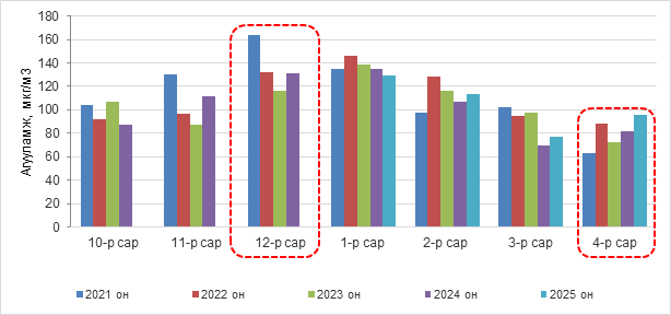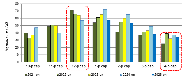 Хүйтний улирал буюу 2024 оны 10-12 сар, 2025 оны 1-4 дүгээр сарын Улаанбаатар хотын агаар дахь бохирдуулах бодисын сарын дундаж агууламжийг өмнөх онуудын мөн үе  2023 оны 10-12 сар, 2024 оны 1-4 дүгээр сарын дундаж агууламжтай харьцуулахад PM2.5 тоосонцор нь 10 мкг/м3 буюу 16%-иар, азотын давхар исэл (NO2) нь 6 мкг/м3-ээр буюу 11%-иар, хүхэрлэг хий (SO2) нь 13 мкг/м3-ээр буюу 16%-иар тус тус бага. Харин PM10 тоосонцор нь 5 мкг/м3-ээр буюу 5%-иар их байна.