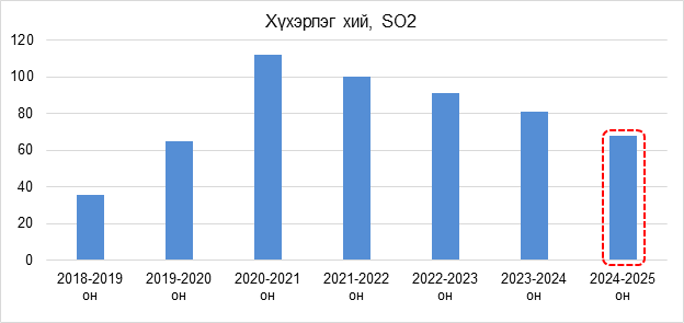 2024 оны 10-12, 2025 оны 1-4 дүгээр сарын хүхэрлэг хийн (SO2) дундаж агууламжийг өмнөх онуудтай харьцуулахад 2018-2019 оноос 32 мкг/м3-ээр буюу 89%-иар их, 2019-2020 оноос 3 мкг/м3-ээр буюу 5%-иар их, 2020-2021 оноос 44 мкг/м3-ээр буюу 39%-иар бага, 2021-2022 оноос 32 мкг/м3-ээр буюу 32%-иар бага, 2022-2023 оноос 23 мкг/м3-ээр 25 %-иар бага, 2023-2024 оноос 13 мкг/м3-ээр 16%-иар бага байна. (Зураг 7).