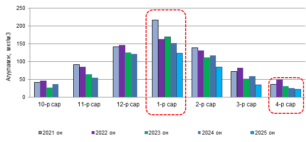 Зураг 8. Хүйтний улирлын хүхэрлэг хийн сарын дундаж агууламж, 2021-2025 он