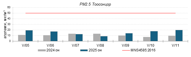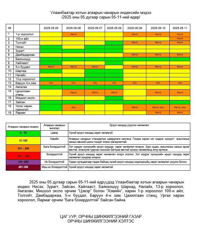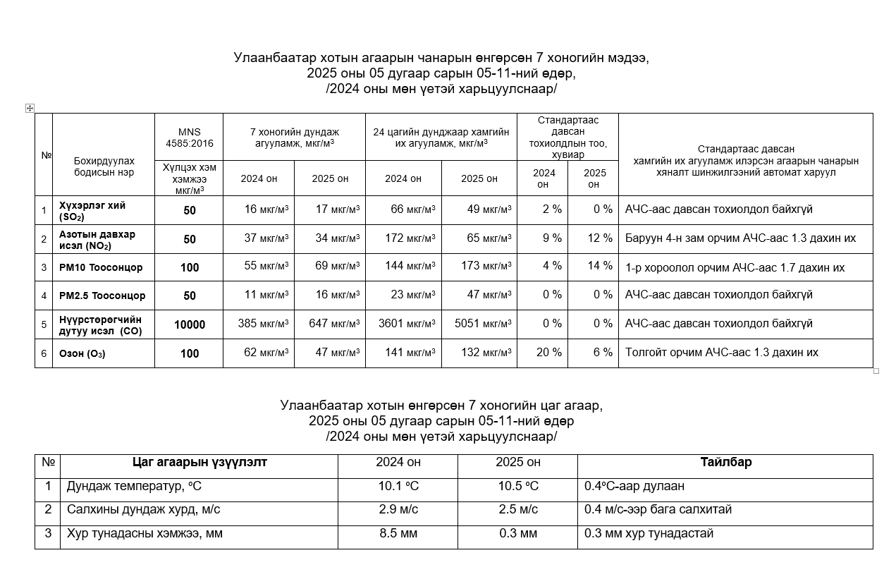 Улаанбаатар хотын агаарт түгээмэл бохирдуулах бодис хүхэрлэг хий /SO2/, азотын давхар исэл /NO2/, тоосонцор /PM10, PM2.5/, нүүрстөрөгчийн дутуу исэл /CO/, озон /O3/-ны агууламжийг тодорхойллоо.