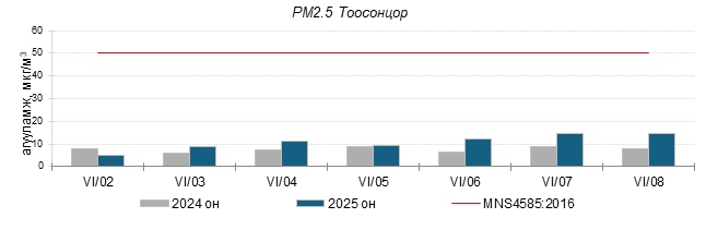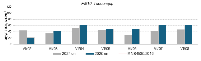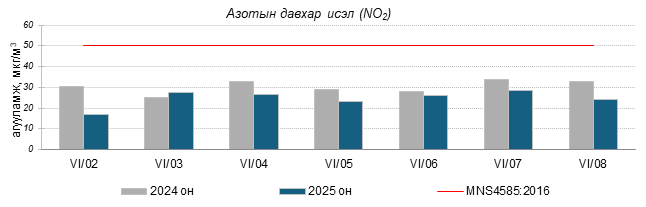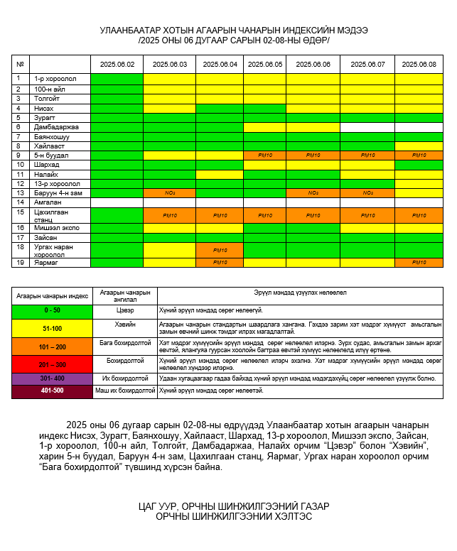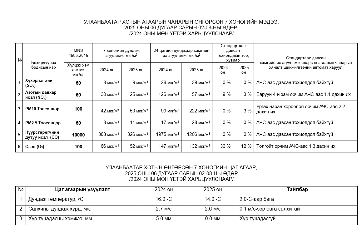 Улаанбаатар хотын агаарт түгээмэл бохирдуулах бодис хүхэрлэг хий /SO2/, азотын давхар исэл /NO2/, тоосонцор /PM10, PM2.5/, нүүрстөрөгчийн дутуу исэл /CO/, озон /O3/-ны агууламжийг тодорхойллоо.
