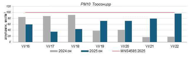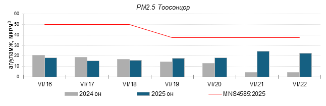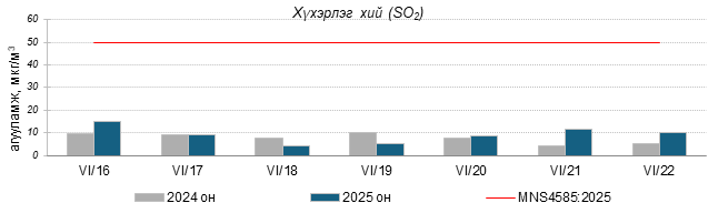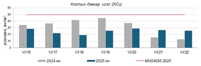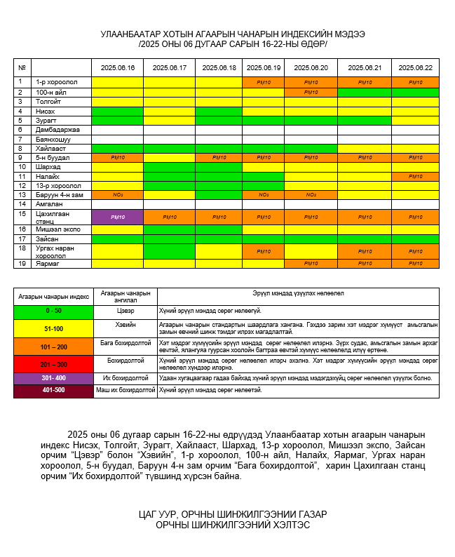 Улаанбаатар хотын агаарт түгээмэл бохирдуулах бодис хүхэрлэг хий /SO2/, азотын давхар исэл /NO2/, тоосонцор /PM10, PM2.5/, нүүрстөрөгчийн дутуу исэл /CO/, озон /O3/-ны агууламжийг тодорхойллоо.