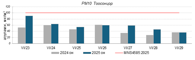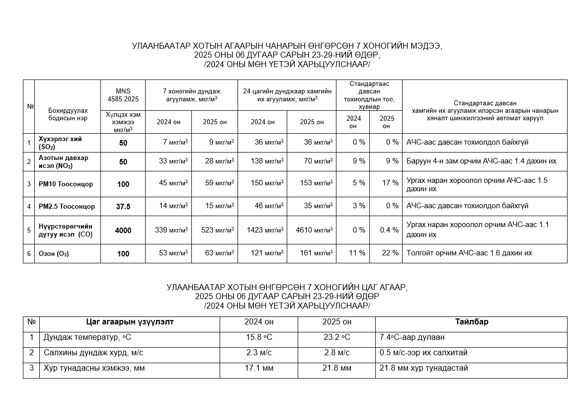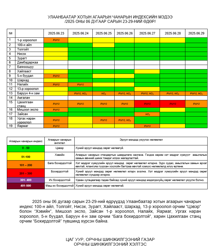 Улаанбаатар хотын агаарын чанарын 7 хоногийн мэдээ /2025.06.23-2025.06.29/