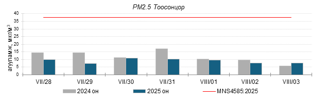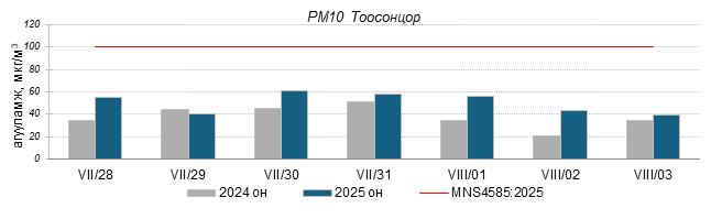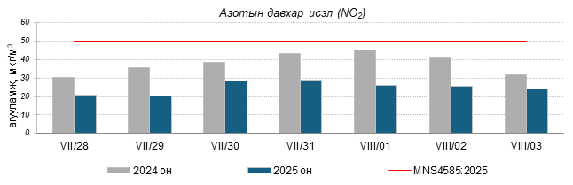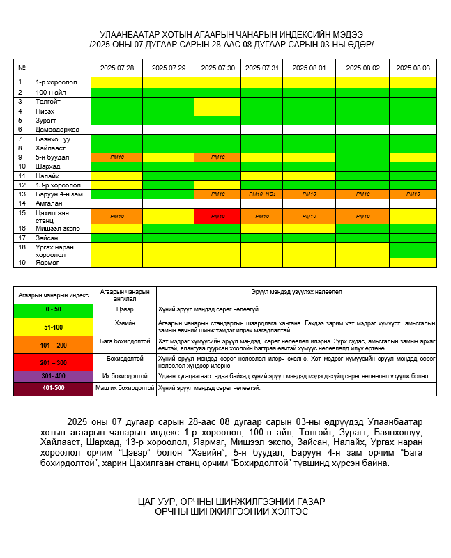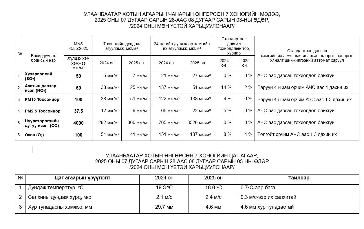 Улаанбаатар хотын агаарт түгээмэл бохирдуулах бодис хүхэрлэг хий /SO2/, азотын давхар исэл /NO2/, тоосонцор /PM10, PM2.5/, нүүрстөрөгчийн дутуу исэл /CO/, озон /O3/-ны агууламжийг тодорхойллоо.