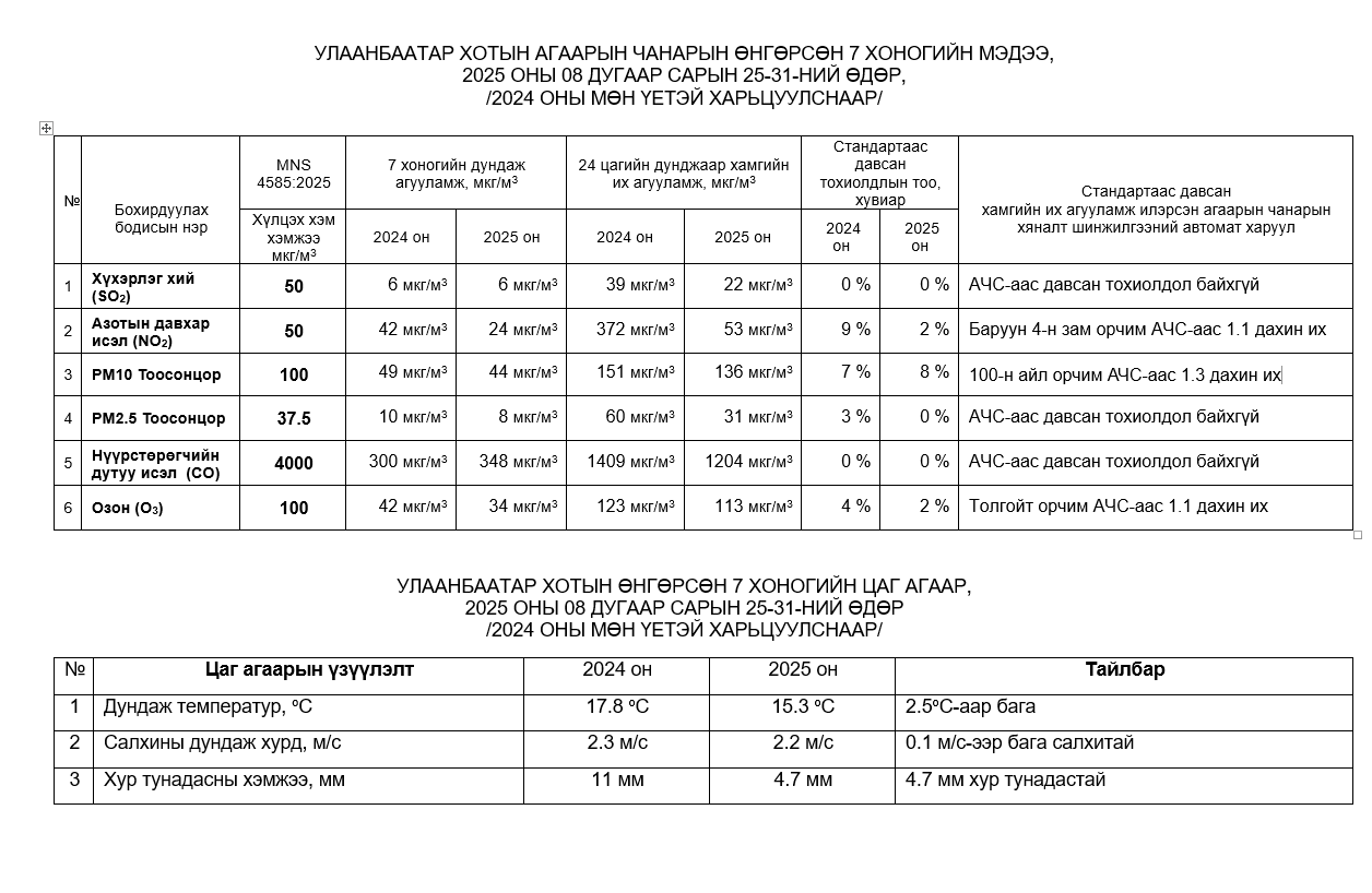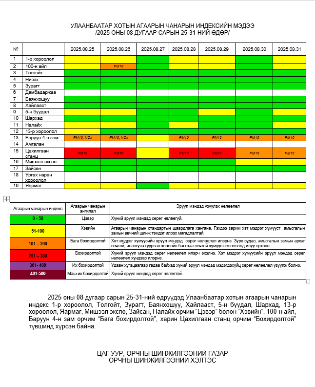 Улаанбаатар хотын агаарын чанарын 7 хоногийн мэдээ /2025.08.25-2025.08.31/