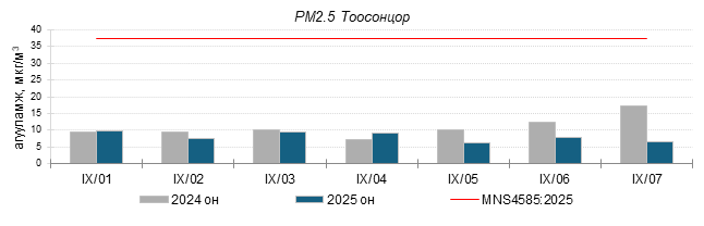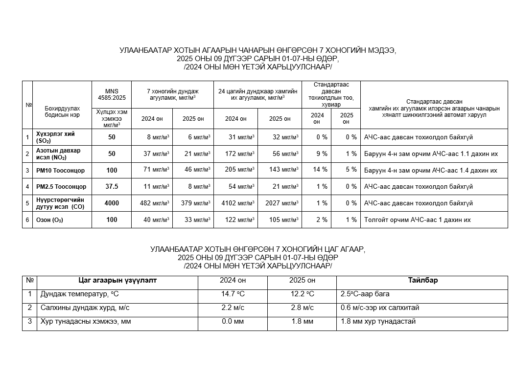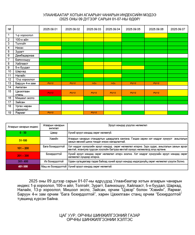 Улаанбаатар хотын агаарт түгээмэл бохирдуулах бодис хүхэрлэг хий /SO2/, азотын давхар исэл /NO2/, тоосонцор /PM10, PM2.5/, нүүрстөрөгчийн дутуу исэл /CO/, озон /O3/-ны агууламжийг тодорхойллоо.