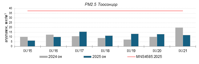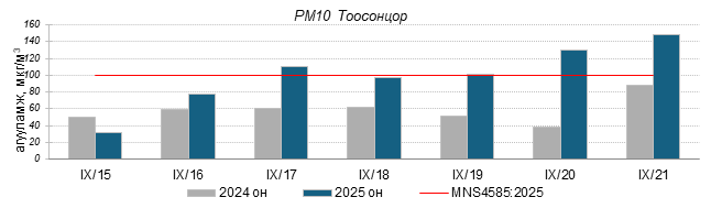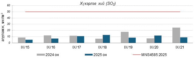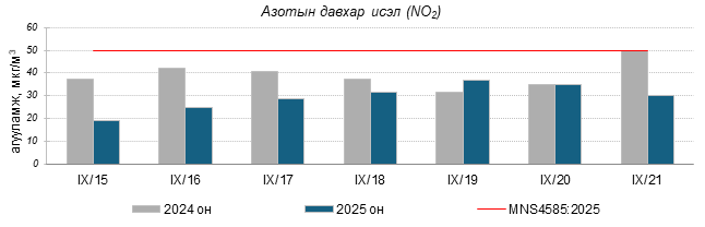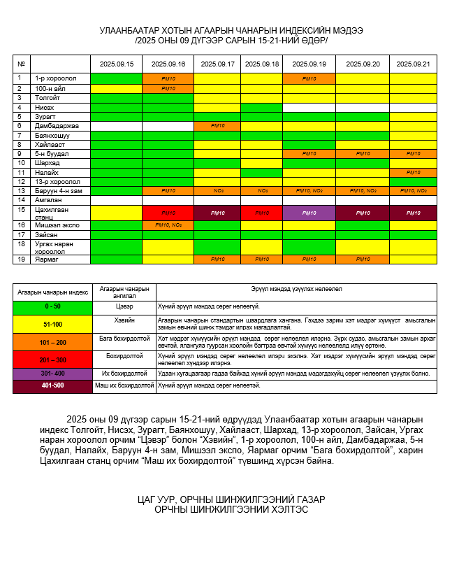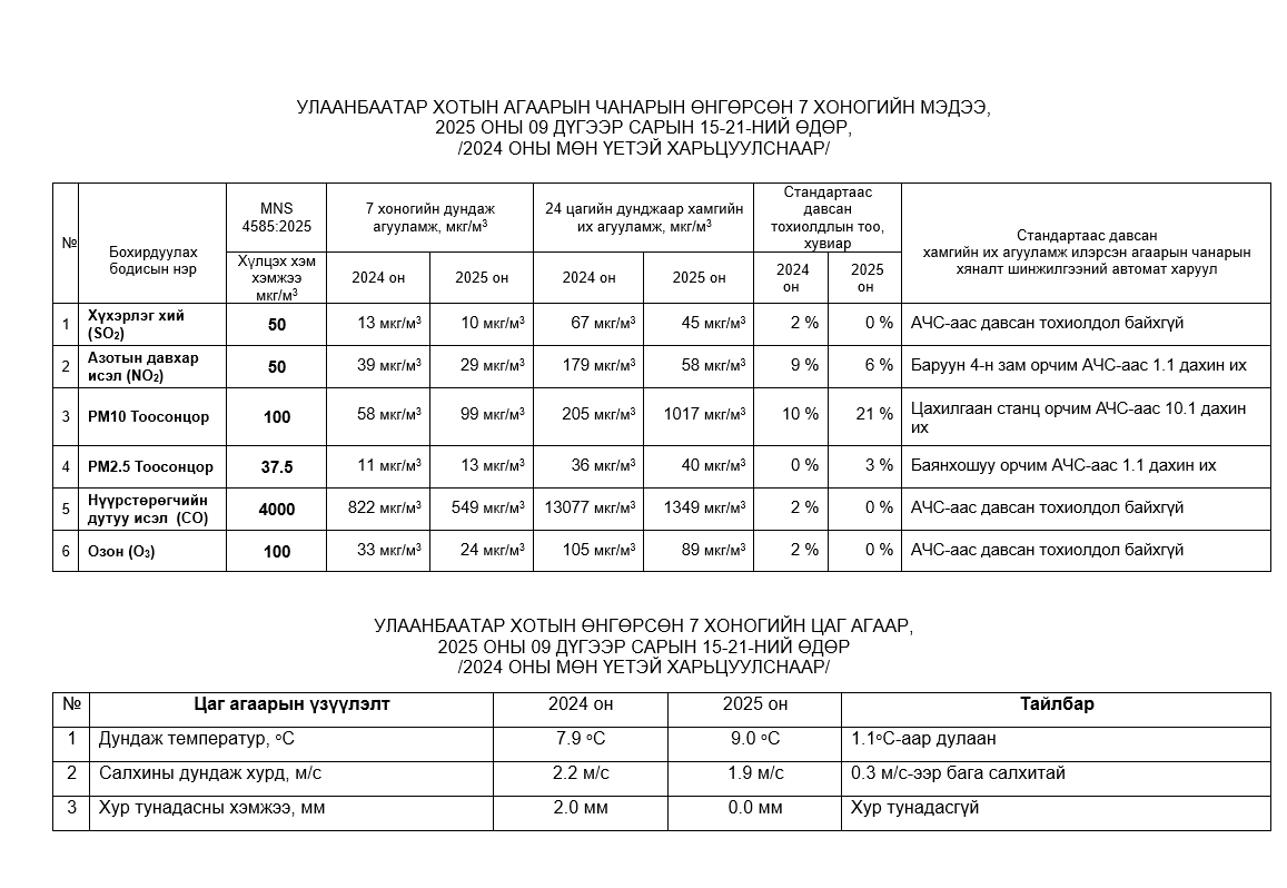 Улаанбаатар хотын агаарт түгээмэл бохирдуулах бодис хүхэрлэг хий /SO2/, азотын давхар исэл /NO2/, тоосонцор /PM10, PM2.5/, нүүрстөрөгчийн дутуу исэл /CO/, озон /O3/-ны агууламжийг тодорхойллоо.