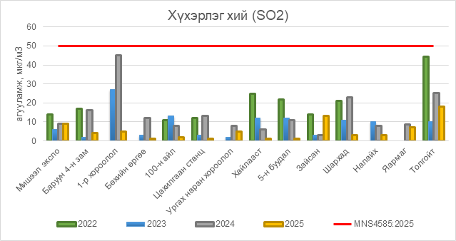 2025 оны 09 дүгээр сарын 23-ны өдрийн байдлаар хүхэрлэг хий (SO2) нь бүх цэгүүдэд MNS4585:2025 АЧС-аас даваагүй байна.