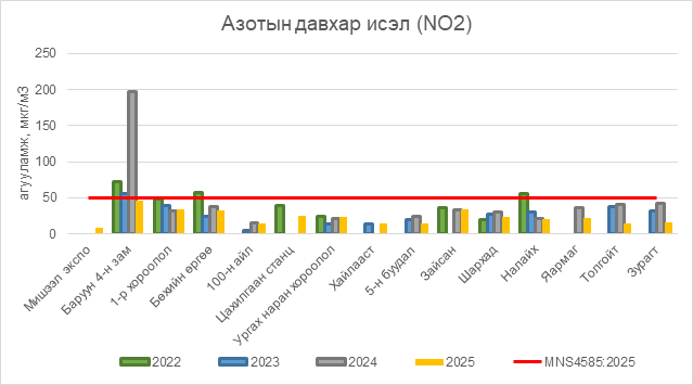 2025 оны 09 дүгээр сарын 23-ны өдрийн байдлаар азотын давхар исэл (NO2) нь бүх цэгүүдэд MNS4585:2025 АЧС-аас даваагүй байна.