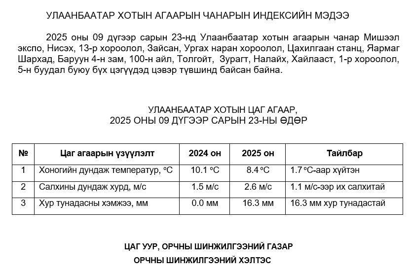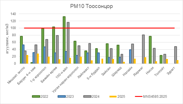 2025 оны 09 дүгээр сарын 23-ны өдрийн байдлаар РМ10 тоосонцор нь бүх цэгүүдэд MNS4585:2025 АЧС-аас даваагүй байна.