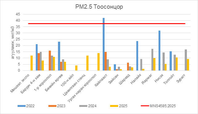 2025 оны 09 дүгээр сарын 23-ны өдрийн байдлаар РМ2.5 тоосонцор нь бүх цэгүүдэд MNS4585:2025 АЧС-аас даваагүй байна.