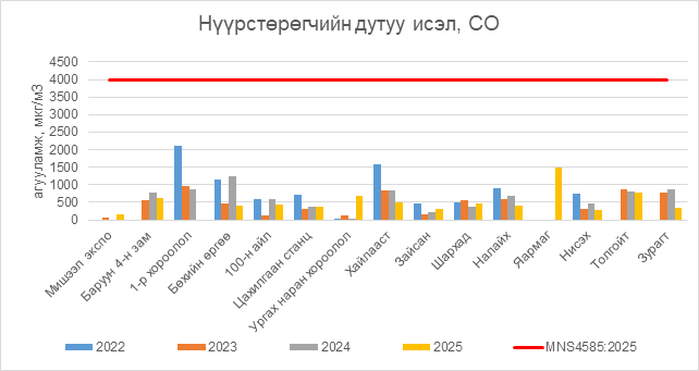 2025 оны 09 дүгээр сарын 23-ны өдрийн байдлаар нүүрстөрөгчийн дутуу исэл (СО) нь бүх цэгүүдэд MNS4585:2025 АЧС-аас даваагүй байна.