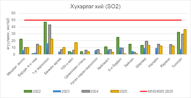 2025 оны 09 дүгээр сарын 25-ны өдрийн байдлаар хүхэрлэг хий (SO2) нь бүх цэгүүдэд MNS4585:2025 АЧС-аас даваагүй байна.