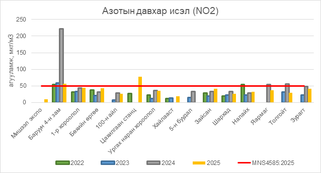 2025 оны 09 дүгээр сарын 25-ны өдрийн байдлаар азотын давхар исэл (NO2) нь Баруун 4-н зам орчим АЧС-аас 6 мкг/м3 –ээр их, Цахилгаан станц орчим АЧС-аас 28 мкг/м3 –ээр их, бусад цэгүүдэд MNS4585:2025 АЧС-аас даваагүй байна.