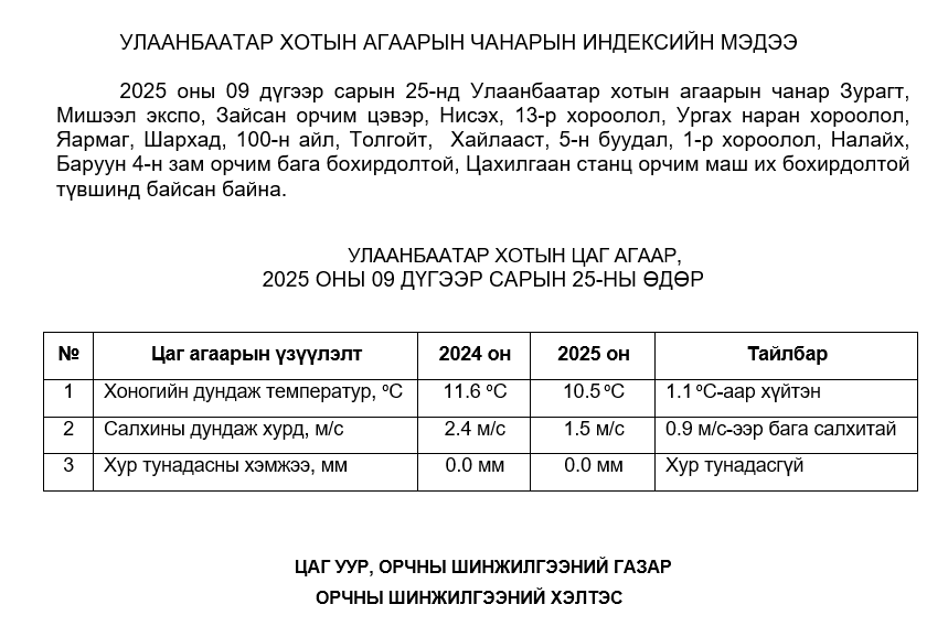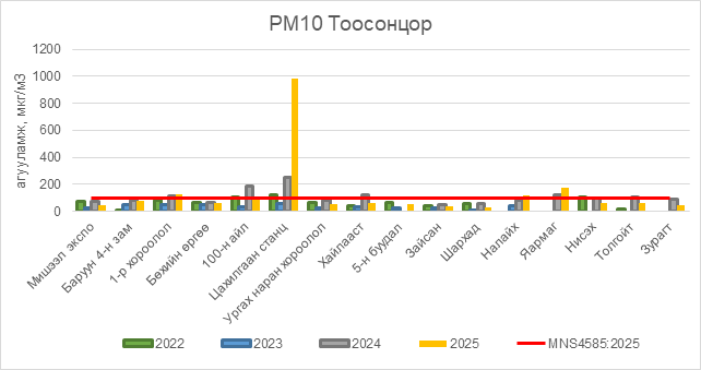 2025 оны 09 дүгээр сарын 25-ны өдрийн байдлаар РМ10 тоосонцор нь 1-р хороолол орчим АЧС-аас 28 мкг/м3 –ээр их, Цахилгаан станц орчим АЧС-аас 884 мкг/м3 –ээр их, Налайх орчим АЧС-аас 20 мкг/м3 –ээр их, Яармаг орчим АЧС-аас 73 мкг/м3 –ээр их, бусад цэгүүдэд MNS4585:2025 АЧС-аас даваагүй байна.