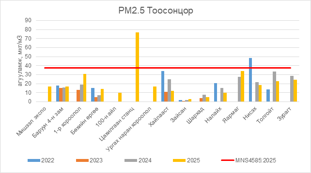 2025 оны 09 дүгээр сарын 25-ны өдрийн байдлаар РМ2.5 тоосонцор нь Цахилгаан станц орчим АЧС-аас 39.5 мкг/м3 –ээр их, бусад цэгүүдэд MNS4585:2025 АЧС-аас даваагүй байна.