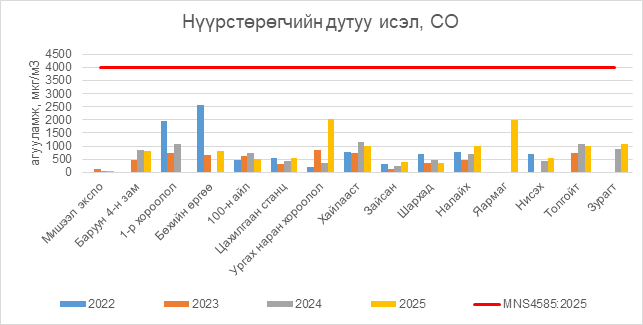 2025 оны 09 дүгээр сарын 25-ны өдрийн байдлаар нүүрстөрөгчийн дутуу исэл (СО) нь бүх цэгүүдэд MNS4585:2025 АЧС-аас даваагүй байна.