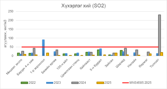 2025 оны 10 дугаар сарын 15-ны байдлаар хүхэрлэг хий (SO2) нь бүх цэгүүдэд MNS 4585:2025 АЧС-аас даваагүй байна.