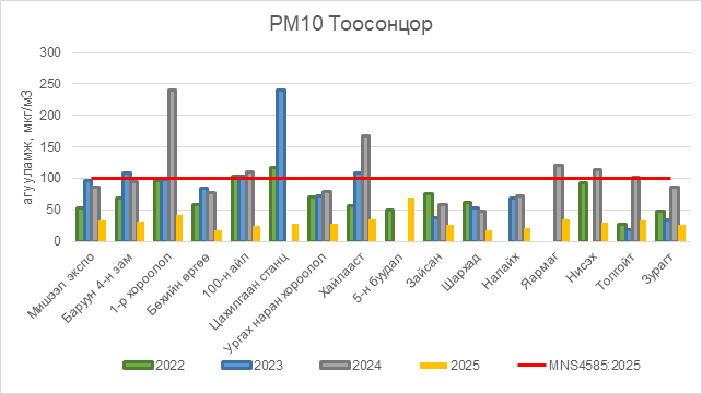 2025 оны 10 дугаар сарын 15-ны байдлаар РМ10 тоосонцор нь бүх цэгүүдэд MNS 4585:2025 АЧС-аас даваагүй байна.