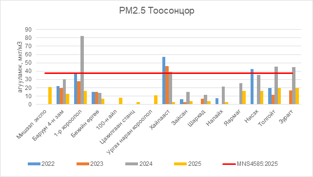 2025 оны 10 дугаар сарын 15-ны байдлаар РМ2.5 тоосонцор нь бүх цэгүүдэд MNS 4585:2025 АЧС-аас даваагүй байна.