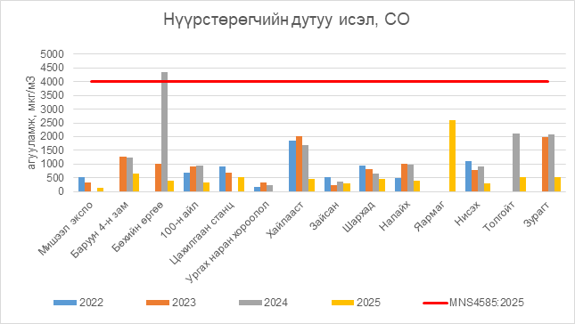 2025 оны 10 дугаар сарын 15-ны байдлаар нүүрстөрөгчийн дутуу исэл (СО) нь бүх цэгүүдэд MNS 4585:2025 АЧС-аас даваагүй байна.