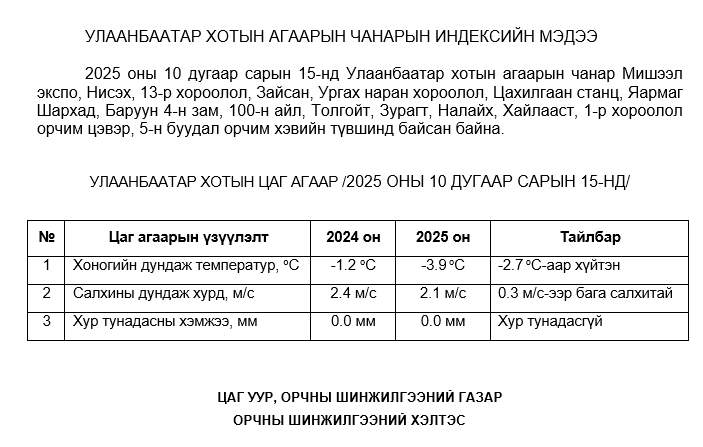 УЛААНБААТАР ХОТЫН АГААРЫН ЧАНАРЫН ХЯНАЛТ ШИНЖИЛГЭЭНИЙ ХОНОГИЙН МЭДЭЭ /2025.10.15/