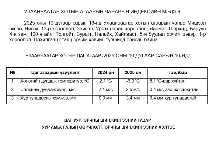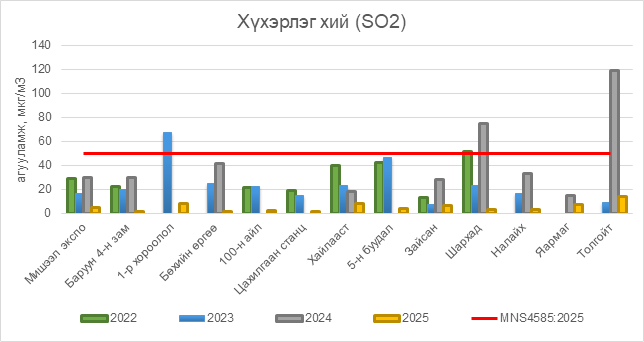 2025 оны 10 дугаар сарын 16-ны байдлаар хүхэрлэг хий (SO2) нь бүх цэгүүдэд MNS 4585:2025 АЧС-аас даваагүй байна.