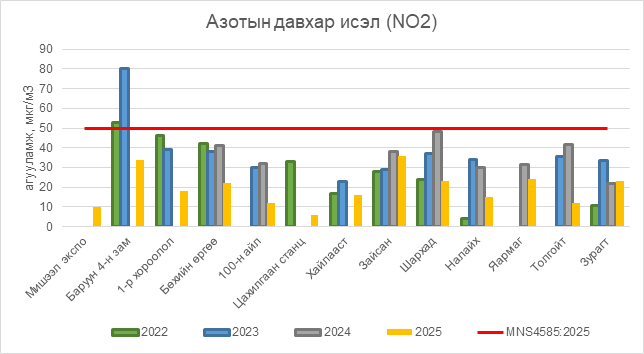 Азотын давхар исэл (NO2) нь бүх цэгүүдэд MNS 4585:2025 АЧС-аас даваагүй байна.