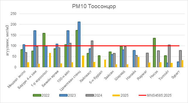 РМ10 тоосонцор нь бүх цэгүүдэд MNS 4585:2025 АЧС-аас даваагүй байна.