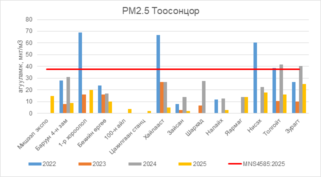 РМ2.5 тоосонцор нь бүх цэгүүдэд MNS 4585:2025 АЧС-аас даваагүй байна.