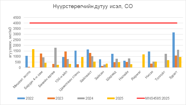Нүүрстөрөгчийн дутуу исэл (СО) нь бүх цэгүүдэд MNS 4585:2025 АЧС-аас даваагүй байна.
