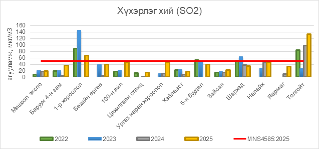 2025 оны 10 дугаар сарын 21-ний байдлаар хүхэрлэг хий (SO2) нь 1-р хороолол орчим 17 мкг/м3 –ээр их, Толгойт орчим АЧС-аас 83 мкг/м3 –ээр их, бусад цэгүүдэд MNS 4585:2025 АЧС-аас даваагүй байна.