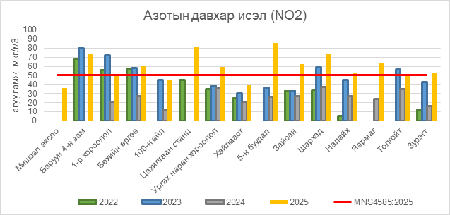 Азотын давхар исэл (NO2) нь Баруун 4-н зам орчим АЧС-аас 24 мкг/м3 –ээр их, Бөхийн өргөө орчим АЧС-аас 20 мкг/м3 –ээр их, Цахилгаан станц орчим АЧС-аас 32 мкг/м3 –ээр их, Ургах наран хороолол орчим АЧС-аас 9 мкг/м3 –ээр их, 5-н буудал орчим АЧС-аас 36 мкг/м3 –ээр их, Зайсан орчим АЧС-аас 12 мкг/м3 –ээр их, Шархад орчим АЧС-аас 23 мкг/м3 –ээр их, Налайх орчим АЧС-аас 2 мкг/м3 –ээр их, Яармаг орчим АЧС-аас 14 мкг/м3 –ээр их, Зурагт орчим АЧС-аас 2 мкг/м3 –ээр их, бусад цэгүүдэд MNS 4585:2025 АЧС-аас даваагүй байна.