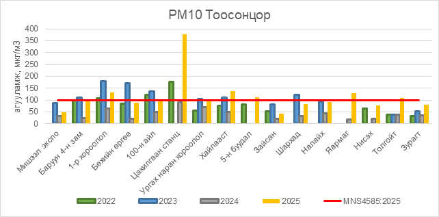 РМ10 тоосонцор нь Баруун 4-н зам орчим АЧС-аас 3 мкг/м3 –ээр их, 1-р хороолол орчим АЧС-аас 33 мкг/м3 –ээр их, Цахилгаан станц орчим АЧС-аас 277 мкг/м3 –ээр их, Хайлааст орчим АЧС-аас 38 мкг/м3 –ээр их, 5-н буудал орчим АЧС-аас 11 мкг/м3 –ээр их, Яармаг орчим АЧС-аас 29 мкг/м3 –ээр их, Толгойт орчим АЧС-аас 8 мкг/м3 –ээр их, бусад цэгүүдэд MNS 4585:2025 АЧС-аас даваагүй байна.