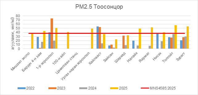 РМ2.5 тоосонцор нь Мишээл экспо орчим АЧС-аас 0.5 мкг/м3 –ээр их, Баруун 4-н зам орчим АЧС-аас 5.5 мкг/м3 –ээр их, 1-р хороолол орчим АЧС-аас 13.5 мкг/м3 –ээр их, 100-н айл орчим АЧС-аас 3.5 мкг/м3 –ээр их, Ургах наран хороолол орчим АЧС-аас 11.5 мкг/м3 –ээр их, Налайх орчим АЧС-аас 11.5 мкг/м3 –ээр их, Яармаг орчим АЧС-аас 14.5 мкг/м3 –ээр их, Нисэх орчим АЧС-аас 2.5 мкг/м3 –ээр их, Толгойт орчим АЧС-аас 19.5 мкг/м3 –ээр их, Зурагт орчим АЧС-аас 16.5 мкг/м3 –ээр их, бусад цэгүүдэд MNS 4585:2025 АЧС-аас даваагүй байна.