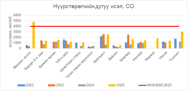 Нүүрстөрөгчийн дутуу исэл (СО) нь Мишээл экспо орчим АЧС-аас 793 мкг/м3 –ээр их, бусад цэгүүдэд MNS 4585:2025 АЧС-аас даваагүй байна.