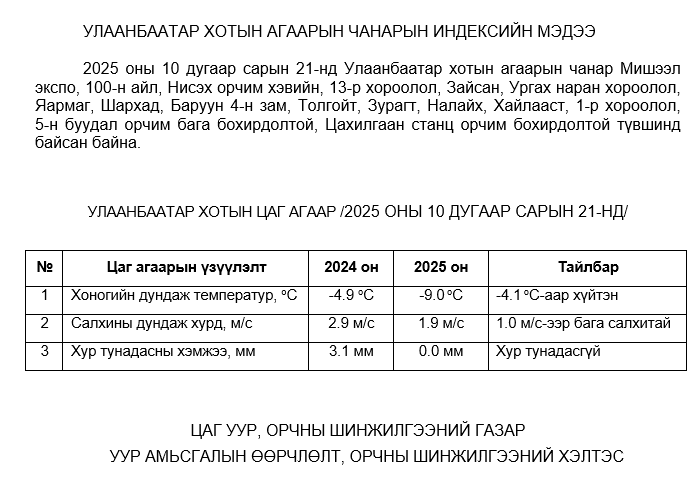 УЛААНБААТАР ХОТЫН АГААРЫН ЧАНАРЫН ХЯНАЛТ ШИНЖИЛГЭЭНИЙ ХОНОГИЙН МЭДЭЭ /2025.10.21/