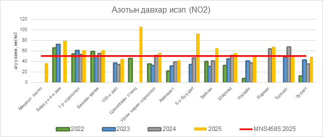 Азотын давхар исэл (NO2) нь Баруун 4-н зам орчим АЧС-аас 29 мкг/м3 –ээр их, 1-р хороолол орчим 11 мкг/м3 –ээр их, Бөхийн өргөө орчим АЧС-аас 11 мкг/м3 –ээр их, Цахилгаан станц орчим АЧС-аас 56 мкг/м3 –ээр их, Ургах наран хороолол орчим АЧС-аас 6 мкг/м3 –ээр их, 5-н буудал орчим АЧС-аас 42 мкг/м3 –ээр их, Зайсан орчим АЧС-аас 15 мкг/м3 –ээр их, Шархад орчим АЧС-аас 5 мкг/м3 –ээр их, Налайх орчим АЧС-аас 1 мкг/м3 –ээр их, Яармаг орчим АЧС-аас 18 мкг/м3 –ээр их, Толгойт орчим АЧС-аас 2 мкг/м3 –ээр их, бусад цэгүүдэд MNS 4585:2025 АЧС-аас даваагүй байна.