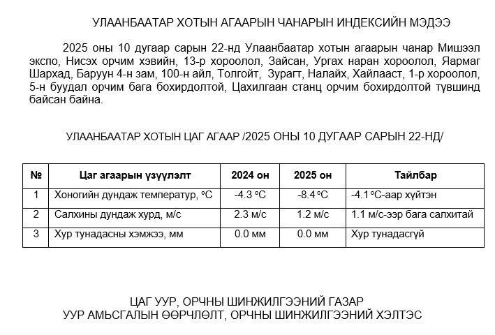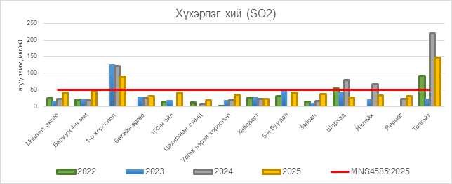 2025 оны 10 дугаар сарын 22-ны байдлаар хүхэрлэг хий (SO2) нь 1-р хороолол орчим 39 мкг/м3 –ээр их, Толгойт орчим АЧС-аас 96 мкг/м3 –ээр их, бусад цэгүүдэд MNS 4585:2025 АЧС-аас даваагүй байна.
